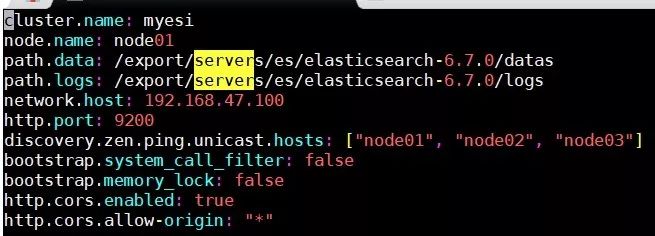cd /export/servers/es/elasticsearch-6.7.0/configmkdir -p /export/servers/es/elasticsearch-6.7.0/logsmkdir -p /export/servers/es/elasticsearch-6.7.0/datasrm -rf elasticsearch.ymlvim elasticsearch.yml