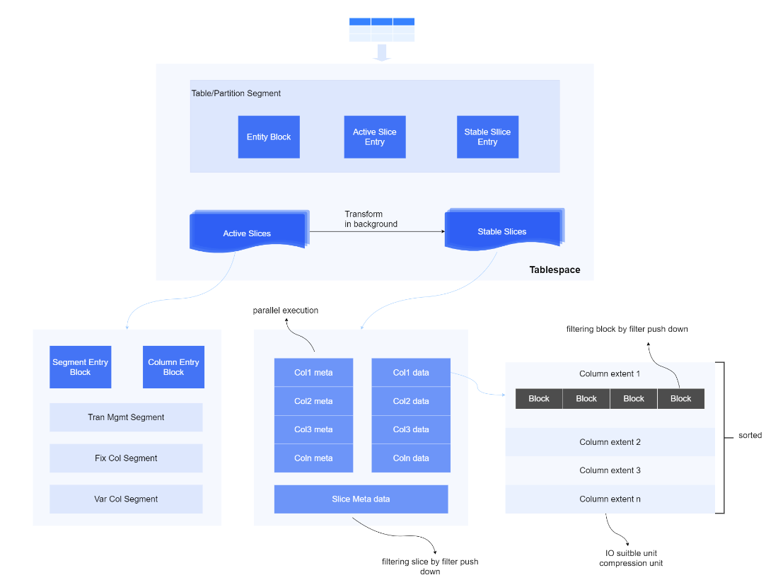 可变列式存储区和稳态数据区的数据均按照表或分区进行组织,对应着Active Slices和Stable Slices两部分,其中Active Slices采用段页式存储(MCOL格式),Stable Slices采用对象存储( SCOL格式 )