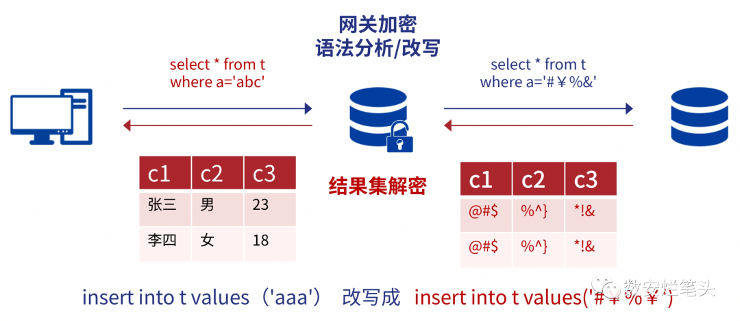 前置加密方式通常为数据库网关方式,其需要在数据库前串联部署一个密码网关设备,使得所有的数据库访问流量都先经过密码网关设备,该设备应用SQL语法解析技术对所有SQL请求进行语法解析,将需要加密的信息进行SQL改写,然后再转发给数据库执行,最后网关设备把数据库返回的结果集中的相应密文字段进行解密成明文返回给客户端。