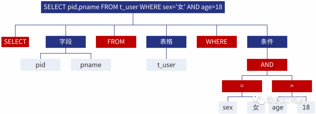 分为词法解析和语法解析。词法解析器⽤于将 SQL 拆解为不可再分的原⼦符号,称为 Token。并根据不同数据库⽅⾔所提供的字典,将其归类为关键字,表达式,字⾯量和操作符。再使⽤语法解析器对 SQL 进⾏理解,并最终提炼出解析上下⽂。解析上下⽂包括表对象、列对象、排序项、分组项、聚合函数、分⻚信息、查询条件信息等,最终转换为抽象语法树。如下图所示: