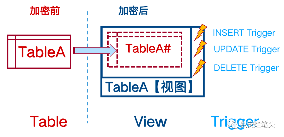第五步以『tableA_enc』创建与原数据表同名的视图对象『tableA』以达到数据访问的透明性,视图中添加对密文列的解密