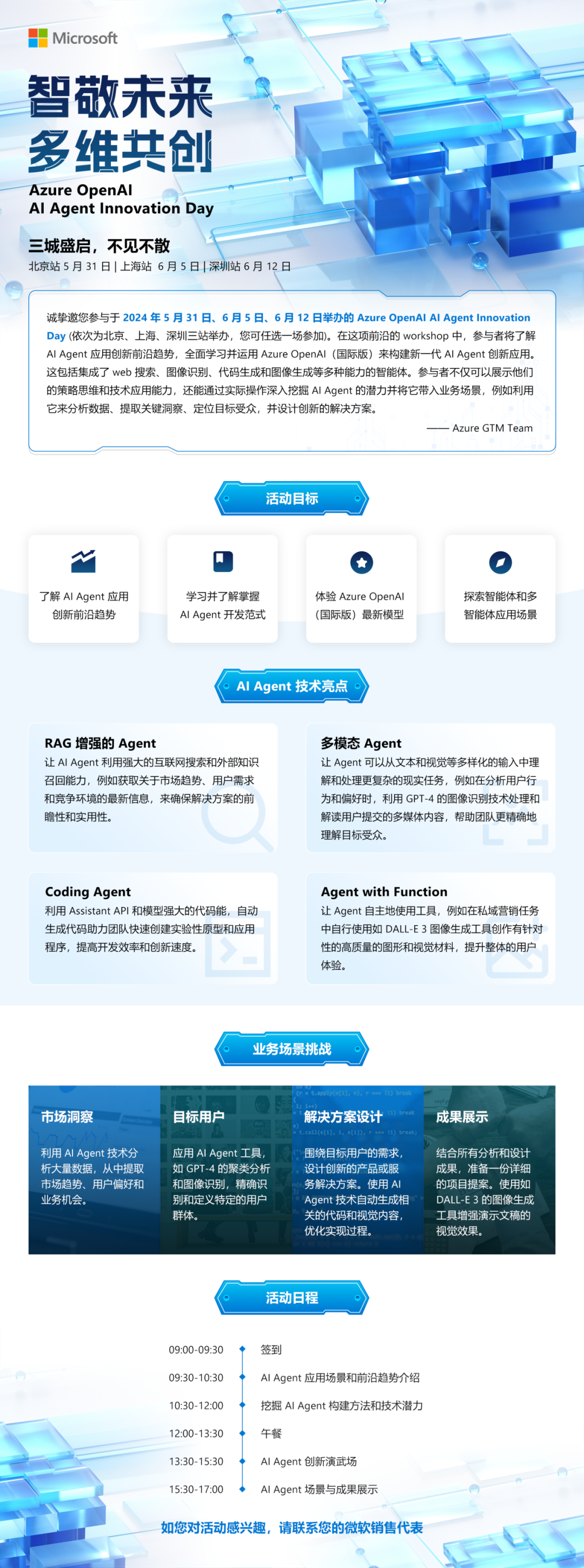 诚邀您参加微软举办的 Azure OpenAI AI Agent Innovation Day。活动介绍如下,如果您对活动感兴趣,请联系您的微软客户经理报名。