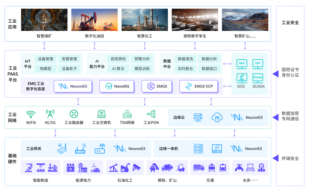 化工行业自动化生产设备多、工业互联网软硬件基础薄弱、数字化应用场景匮乏。EMQ 利用工业边缘网关软件 NeuronEX 灵活的数据采集和分析能力,实时监测化工生产设备的运行状态,结合多源数据接入、流式计算与集成功能,对复杂的数据接口、数据结构进行智能化处理,为企业搭建贯通研发设计、生产制造、经营管理等全链条的数据资产库,为后续数据利用打好基础。复杂的工业生产环境下,机器设备之间的连接与通信至关重要。EMQ 统一接入平台 EMQX Platform 与边缘端工业网关软件 NeuronEX 无缝集成,连接云端的各类数据库与业务应用,实现化工生产数据的互联互通,从而构建泛在感知网络环境,打破化工设计、生产、管理和服务不同环节的数据孤岛,实现企业内部业务数据的集成与协同,推动产业链上下游间资源数据跨地域、跨行业共享。作为流程制造行业,数据价值是化工企业数字化、智能化转型的关键动力。EMQ 的云边协同数据解决方案,满足对海量工业设备进行实时监控、异常事件告警处理、生产过程控制与优化、预测性维护、产品质量溯源、远程运维服务、智能供应链管理以及视觉 AI 缺陷检测等需求,能够推动化工企业从传统的经验型决策向数据驱动的智能型决策转变,全面提升生产精准管控水平和效率效益。作为国民经济支柱产业,加快数字化和工业化深度融合、培育新质生产力是能源化工行业未来发展的必然选择。EMQ 以全新的数据利用和管理方式,连接物理世界与人工智能,为能源化工企业构建数据驱动的智能流程制造管理系统,协助企业更加快速的开发创新业务应用,更好地适应新质生产力的发展需求。
