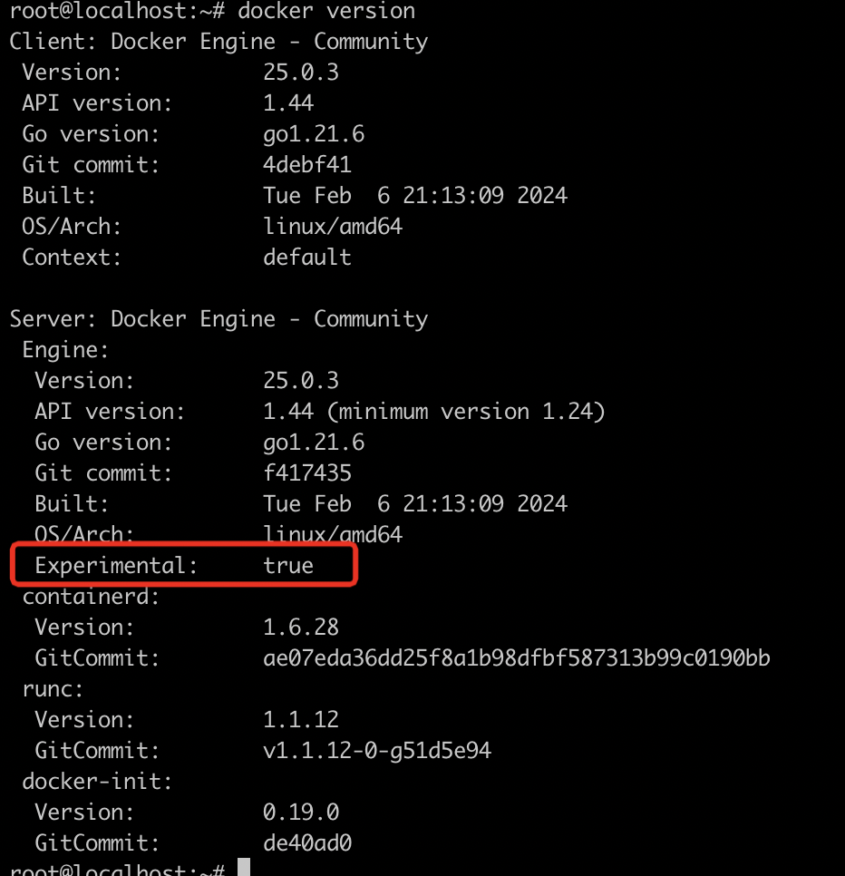root@localhost:~# docker --versionDocker version 25.0.3, build 4debf41