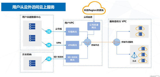 用户自建数据中心/分支机构通过云专线、VPN、SD-WAN产品接入用户云上VPC内部,通过VPC内部已经建立的终端节点,用户即可在云外可以使用私网访问后端共享的云服务。通过云间高速产品,实现在其他Region跨区域访问云服务。