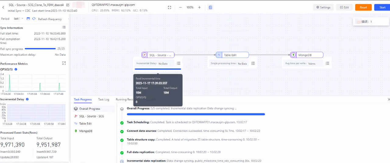 配置数据管道,实现 25 个表从 SQL Server 到 MongoDB 的实时数据复制。