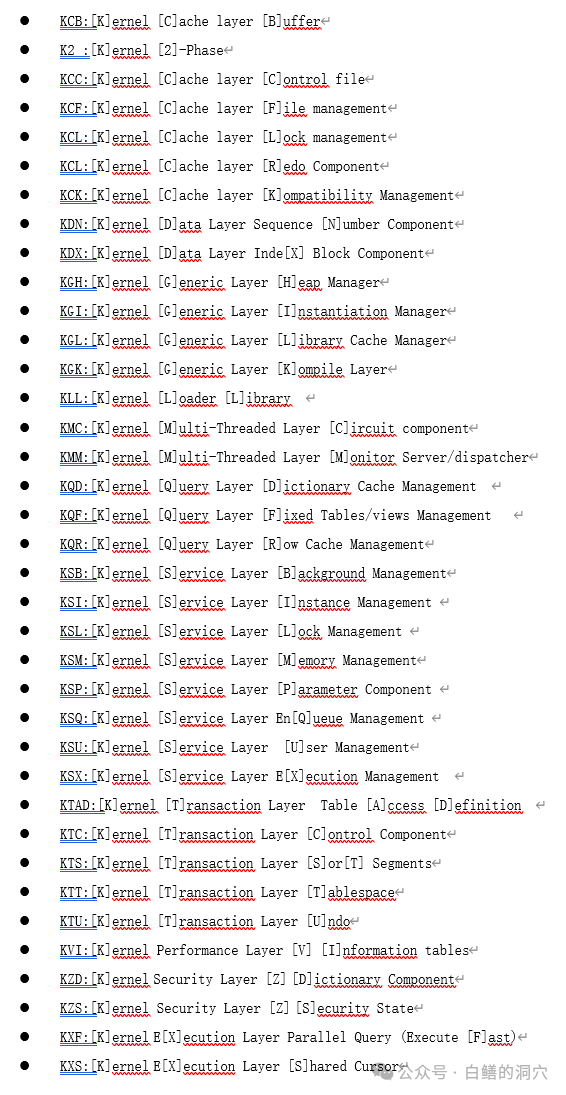如果你了解了一些Oracle内核的缩略语,处理起类似的问题就简单多了。比如[K]ernel, [C]ache, [B]uffer。那么连起来kcbxxx大概率是和DB CACHE相关的。记住一些这方面的知识,说不准哪天就用得上了。下面的内容来自于早期的一份Oracle内部文档,从Oracle 10g以后,这方面的资料比较少能找到了。常见的缩略语包括: