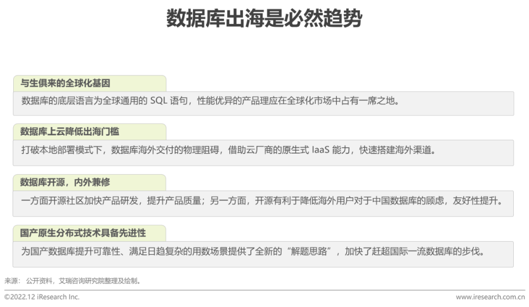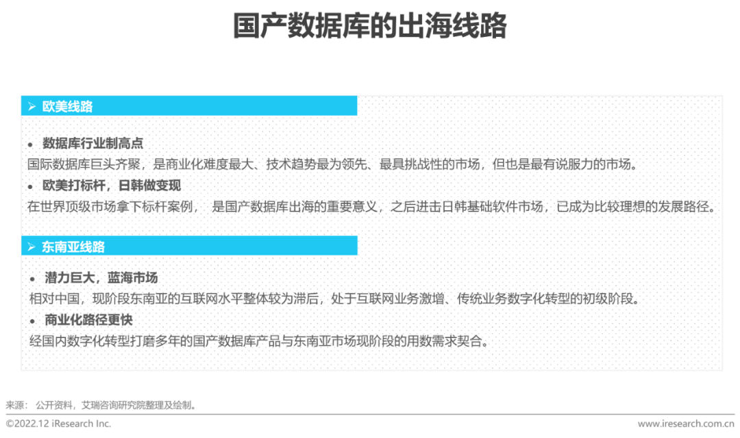 近些年来,国产数据库厂商很多都在尝试出海,部分企业已经取得不俗的成绩。个中原因,一方面是因为本土数据库企业很多,出海相对可解决过度内卷问题;一方面是以分布式、多模(时序、图、内存)等新形态数据库出现,相较于传统数据库,更容易实现弯道超车。当然,本土数据库企业出海问题也不少,最大问题就是需解决信任的问题,特别是如数据库这种比较关键的核心基础设施。这里就不展开了,借用来自艾瑞咨询的一篇报告内容,说明下数据库出海的趋势及路径。