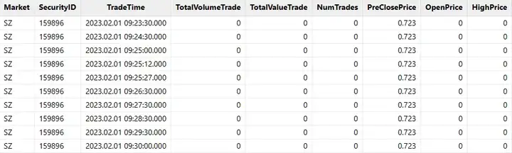 与基于实时快照行情数据合成 K 线类似,在创建数据库和分区表、导入 csv 测试数据后,同样需要对原始行情快照数据进行处理、针对处理后的快照行情进行1分钟窗口和1分钟步长的聚合计算、以及填充缺失的快照行情计算窗口。同时,用户只需对代码进行封装后运行,即可通过并行计算高效合成分钟 K 线。