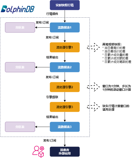 基于实时快照行情数据合成 K 线的过程中共涉及3个流处理引擎与3张流数据表:
