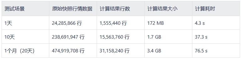 测试证明,DolphinDB 在海量数据的批计算性能上同样表现优异。基于16个 CPU 核心完成1天沪深全市场24,285,866 行原始快照行情的降频 K 线计算只需4.7秒,输出1分钟 K 线数据量为 1,555,440 行。