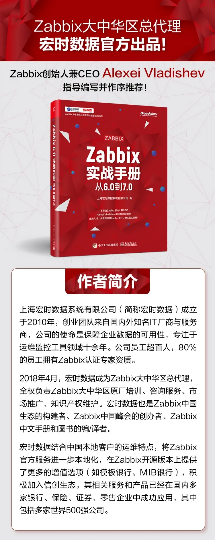 活动主旨为IT行业从业者推荐优秀的技术书籍。第一期我们推荐的书籍是来自电子工业出版社博文视点品牌的新书《Zabbix 实战手册:从 6.0 到 7.0》,我们都知道,Zabbix 是一款非常优秀的企业级的分布式开源监控方案,可以监控众多网络参数,为软硬件及云监控提供强有力的监控保障,在监控工具纷纭的当下,Zabbix仍能保证强大的活力和创新,为大家不断带来惊喜。