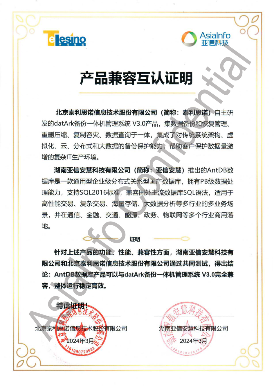 泰利思诺自主研发的datArk备份一体机管理系统 V3.0产品,集数据备份和恢复管理、重删压缩、复制容灾、数据查询于一体,集成了对传统系统架构、虚拟化、云、分布式和大数据的备份保护能力,帮助客户保护数据量激增的复杂IT生产环境。亚信安慧AntDB数据库与北京泰利思诺公司备份一体机产品的认证,将进一步满足双方客户数智化转型过程中的数据管理需求,帮助客户提升IT系统升级改造的速度和效率,共同助力我国信创产业新发展。AntDB数据库始于2008年,在运营商的核心系统上,服务国内24个省市自治区的数亿用户,具备高性能、弹性扩展、高可靠等产品特性,峰值每秒可处理百万笔通信核心交易,保障系统持续稳定运行超十年,并在通信、金融、交通、能源、物联网等行业成功商用落地。