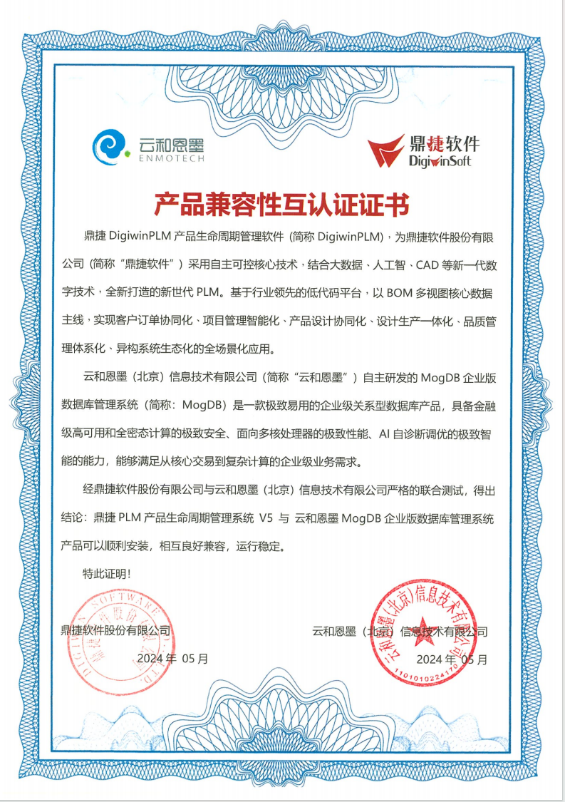产品兼容性互认证是产业链上下游协同中的重要一环,对于构建产业生态圈、形成自主开放体系、推动国产软件创新发展具有关键作用。此前,MogDB数据库已完成了与鼎捷软件ERP产品T100、鼎华智能车间执行软件sMES的产品兼容性互认证。