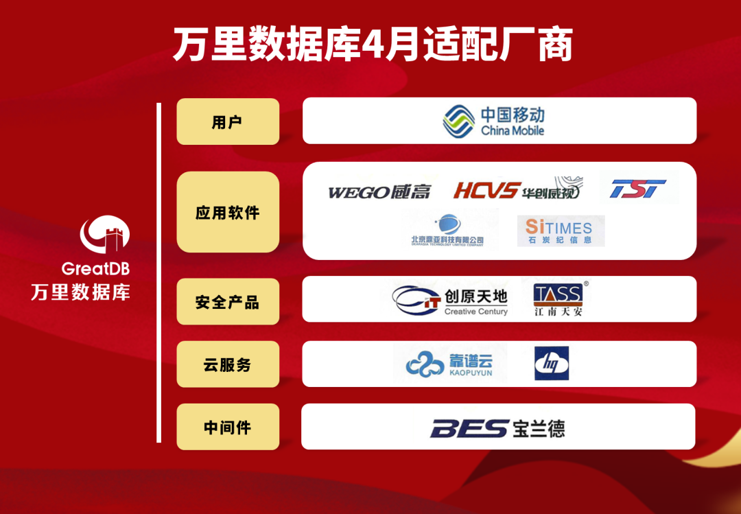 基于此背景,万里数据库未来将持续发布生态适配月报,诚邀广大产业链伙伴,共同见证基于万里安全数据库GreatDB的生态建设成果。