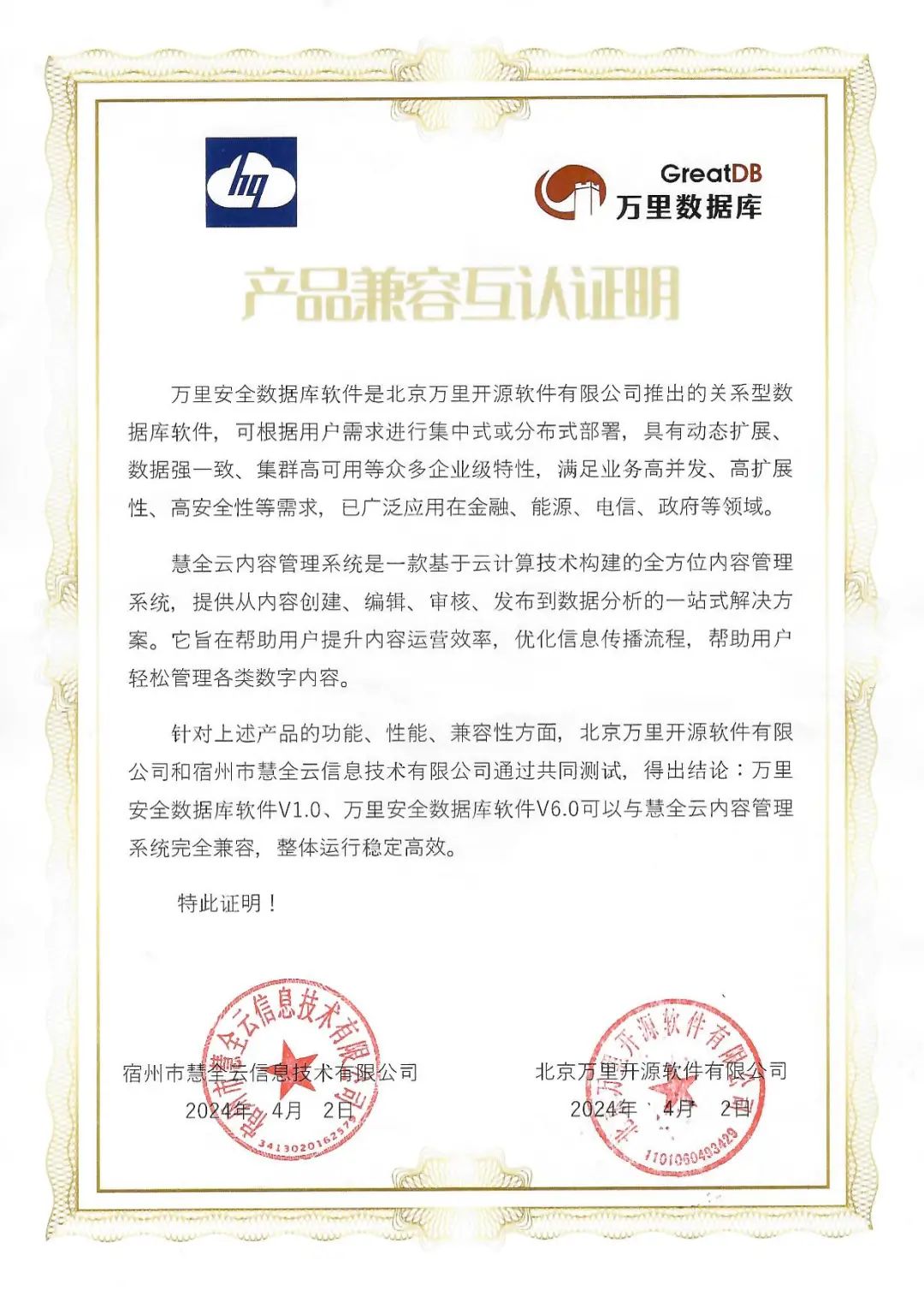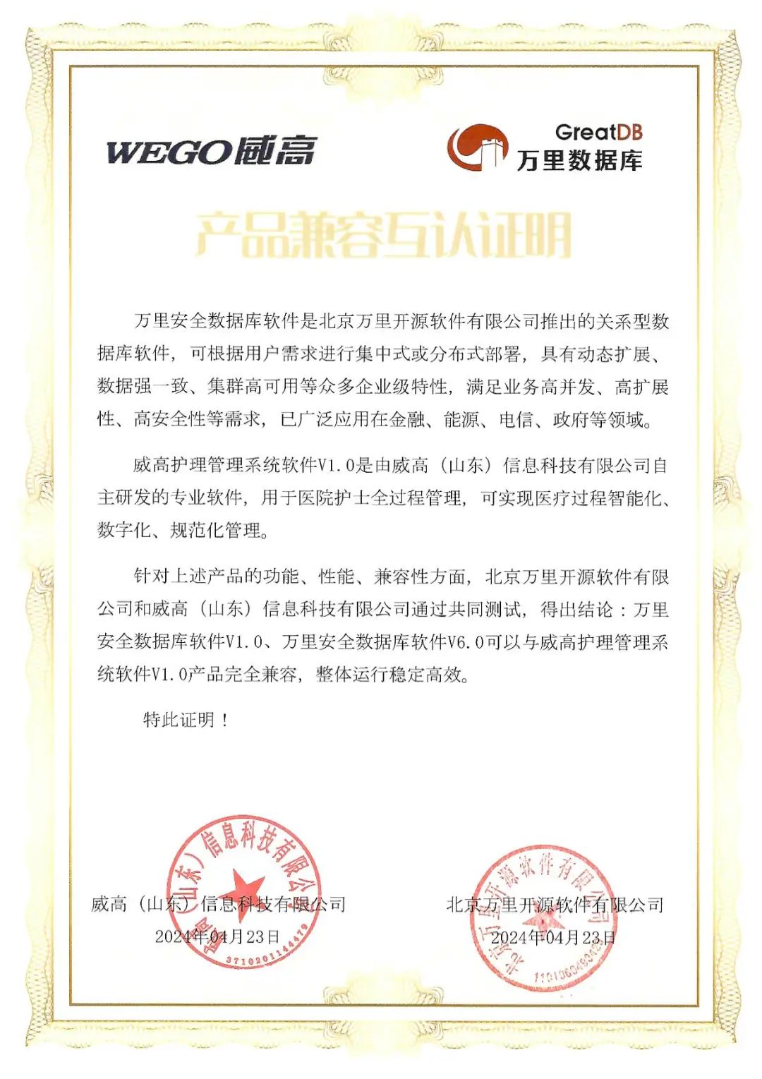 尤其在医疗行业,GreatDB与威高医疗旗下血液净化质控管理平台V1.0 、肾科科研分析平台V1.0 、智慧病房管理平台V2.0、腹膜透析信息管理系统V3.0等19款产品完成兼容认证,验证了安全数据库GreatDB在医疗行业成熟稳定的企业级能力。产品兼容认证将成为双方深入合作的起点,未来将共同为医疗行业用户打造高可靠、易扩展且具备卓越性能的解决方案,赋能医疗行业数字化建设升级。