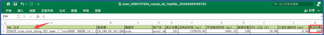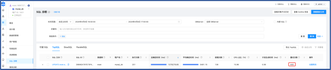 结果为 1 小时内执行了 505 次,判断针对该行数据的 UPDATE 行为可能存在异常。 日志打印 SQL 次数可能与 Top SQL 不同,大致对应上即可。 一般异常 SQL 会在 observer.log
