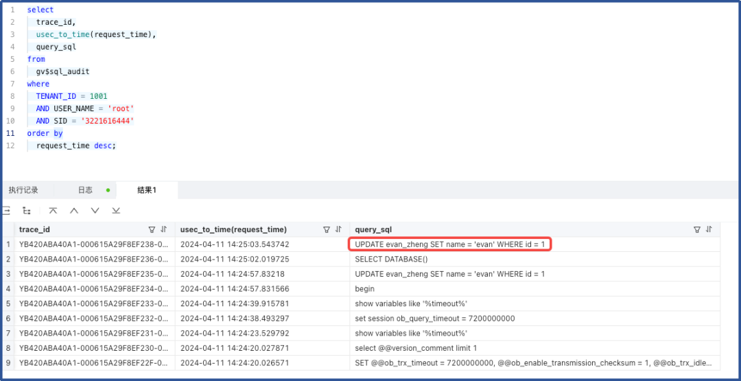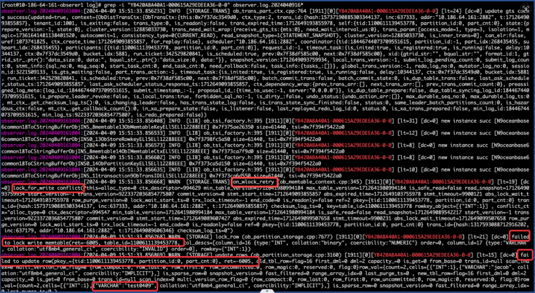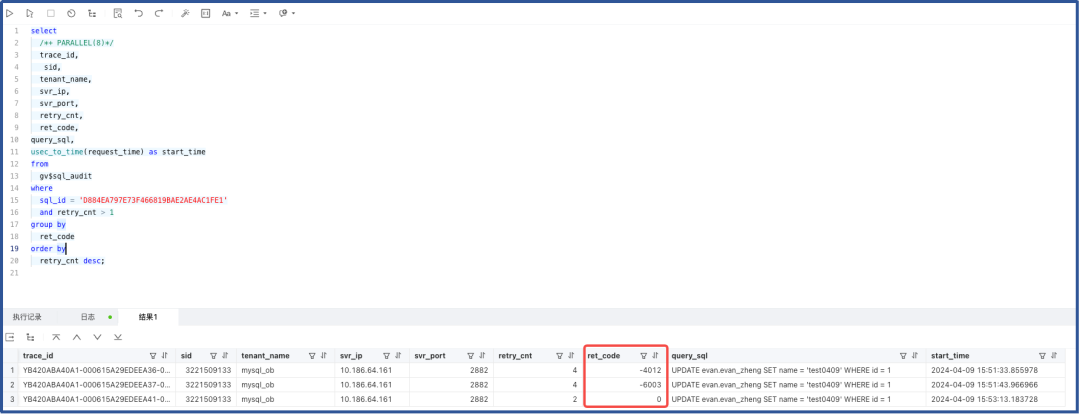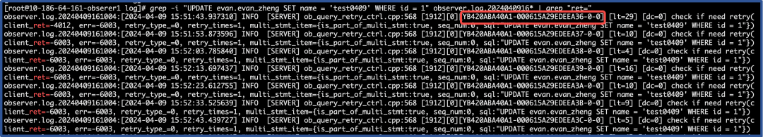 # grep -i "UPDATE evan.evan_zheng SET name = 'test0409' WHERE id = 1" observer.log.2024040916* | grep "ret="