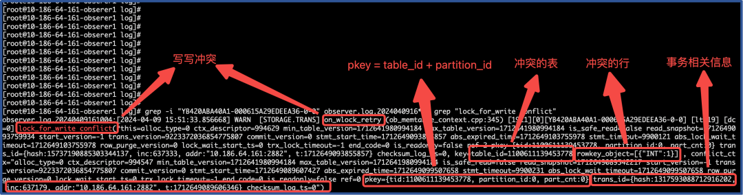 # grep -i "YB420ABA40A1-000615A29EDEEA36-0-0" observer.log.2024040916* | grep "lock_for_write conflict"