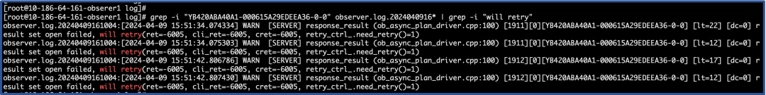# grep -i "YB420ABA40A1-000615A29EDEEA36-0-0" observer.log.2024040916* | grep -i "will retry"