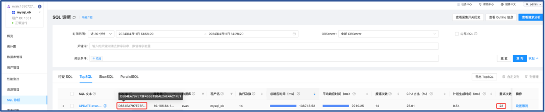 关于此 SQL 相关信息已被清理,且 Top SQL 未提示报错具体原因,只能基于日志文件进行排查。OCP 云平台查看初始状态如下: UPDATE 语句重试 440 次 平均响应时间为 5491.15 ms