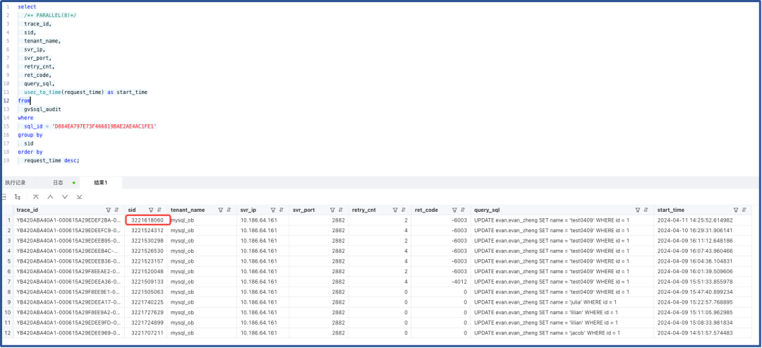 查询出来的是一致的(即,异常重试的 SQL 的会话)。