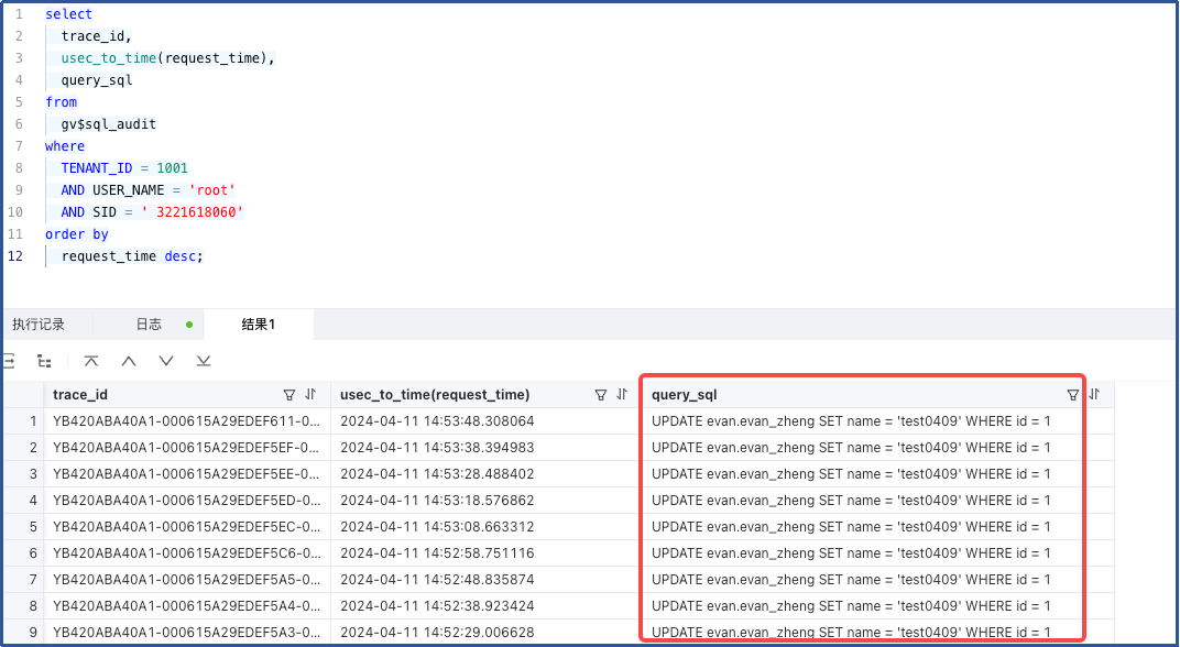 当执行 SQL UPDATE evan.evan_zheng SET name = 'test0409' WHERE id = 1;