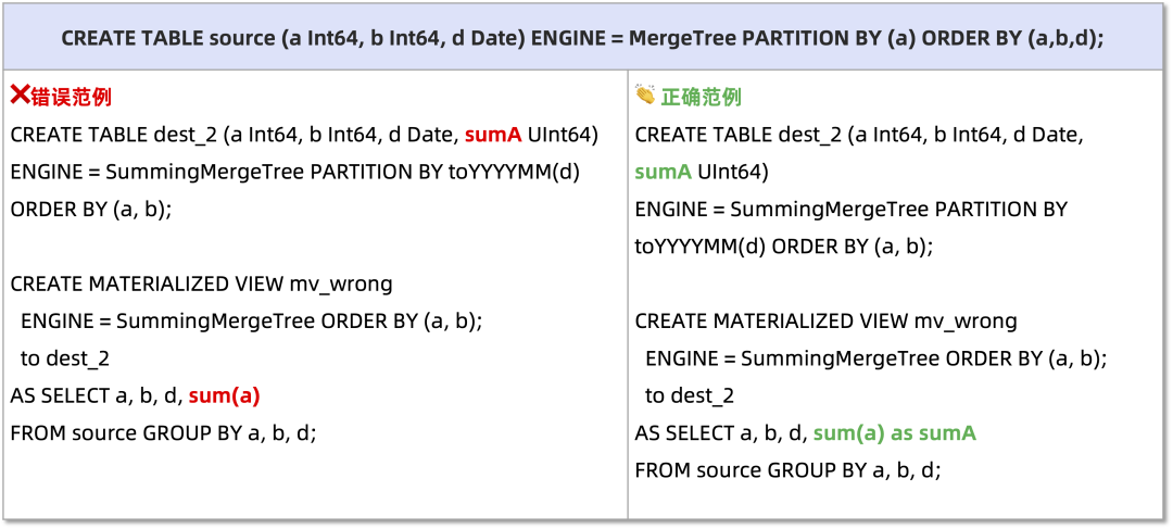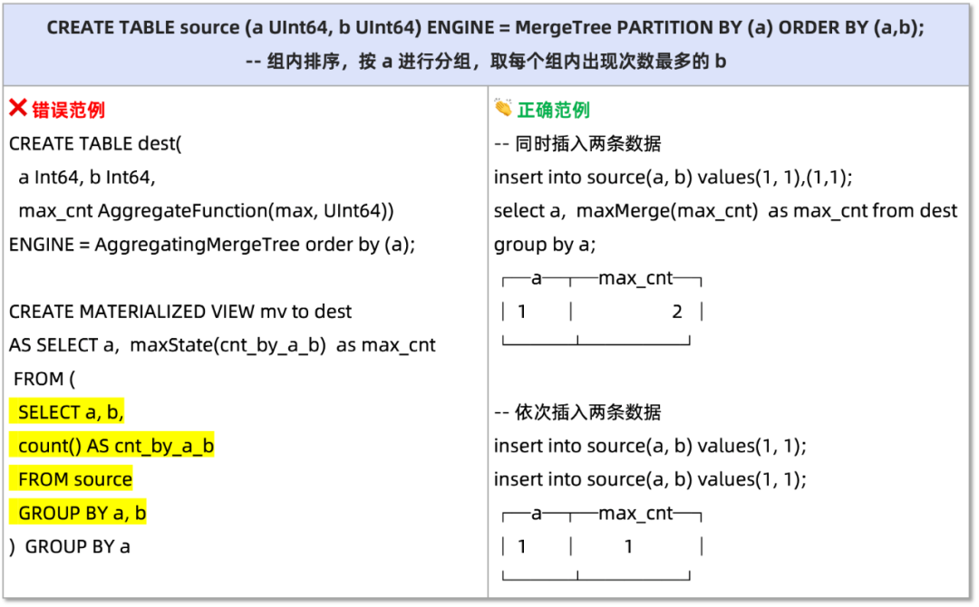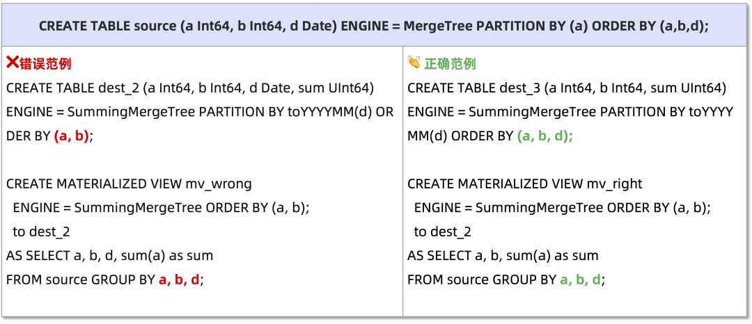 CREATE TABLE source (a Int64, b Int64)ENGINE = MergeTree PARTITION BY (a) ORDER BY (a,b);-- 目标表错误的使用 MergeTree 引擎CREATE TABLE dest (a Int64, b Int64, cnt Int64)ENGINE = MergeTree PARTITION BY (a) ORDER BY (a,b);-- 创建基于 dest 表创建物化视图CREATE MATERIALIZED VIEW mv to destAS SELECT a, b, count() as cntFROM source GROUP BY a, b;-- 执行源表插入insert into source(a,b) values(1, 1), (1,1), (1,2);insert into source(a,b) values(1, 1), (1,1), (1,2);-- MV 实际查询结果,不符合预期SELECT a,b,count() FROM dest GROUP BY a, b;┌─a─┬─b─┬─count()─┐│ 1 │ 2 │ 2 ││ 1 │ 1 │ 2 │└───┴───┴─────────┘-- 预期的正确结果SELECT a, b, count() as cnt FROM source GROUP BY a, b┌─a─┬─b─┬─sum─┐│ 1 │ 2 │ 2 ││ 1 │ 1 │ 4 │└───┴───┴─────┘