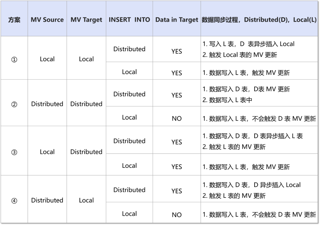 其中方案②如果数据实际执行写入到Local表中,则会导致MV中的数据不同步。
