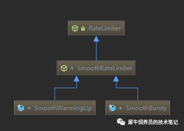 RateLimiter 是一个抽象类,SmoothRateLimiter 继承自 RateLimiter,也是一个抽象类,SmoothBursty 和 SmoothWarmingUp 是具体的实现类。