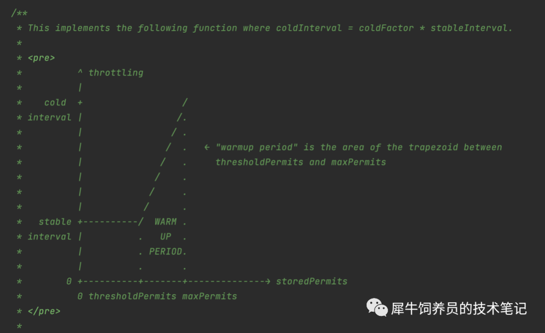 分成两个区间:[0, thresholdPermits) 和 [thresholdPermits, maxPermits],存在一个"热身"的阶段,thresholdPermits 是系统 stable 阶段和 cold 阶段的临界点。从 thresholdPermits 右边的部分拿走 permit 需要等待的时间更长(面积更大)。