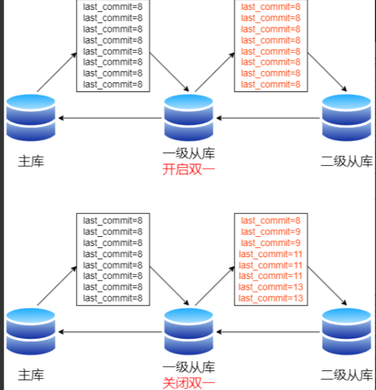 下图为复制链路示意图:关闭双一前,一级/二级从库能高并发回放。关闭双一后,二级从库并发降级。