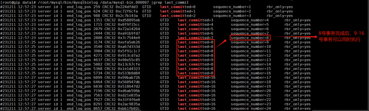 如下图所示,开启双一情况下,一级从库binlog的last_commit。二级从库回放时,8号事务完成后,9-16号事务可以并行回放。