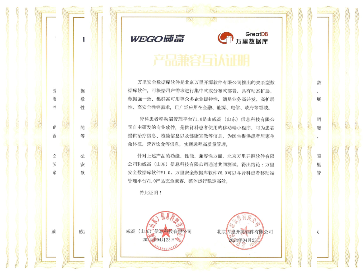 尤其在医疗行业,GreatDB与威高医疗旗下血液净化质控管理平台V1.0 、肾科科研分析平台V1.0 、智慧病房管理平台V2.0、腹膜透析信息管理系统V3.0等19款产品完成兼容认证,验证了安全数据库GreatDB在医疗行业成熟稳定的企业级能力。产品兼容认证将成为双方深入合作的起点,未来将共同为医疗行业用户打造高可靠、易扩展且具备卓越性能的解决方案,赋能医疗行业数字化建设升级。