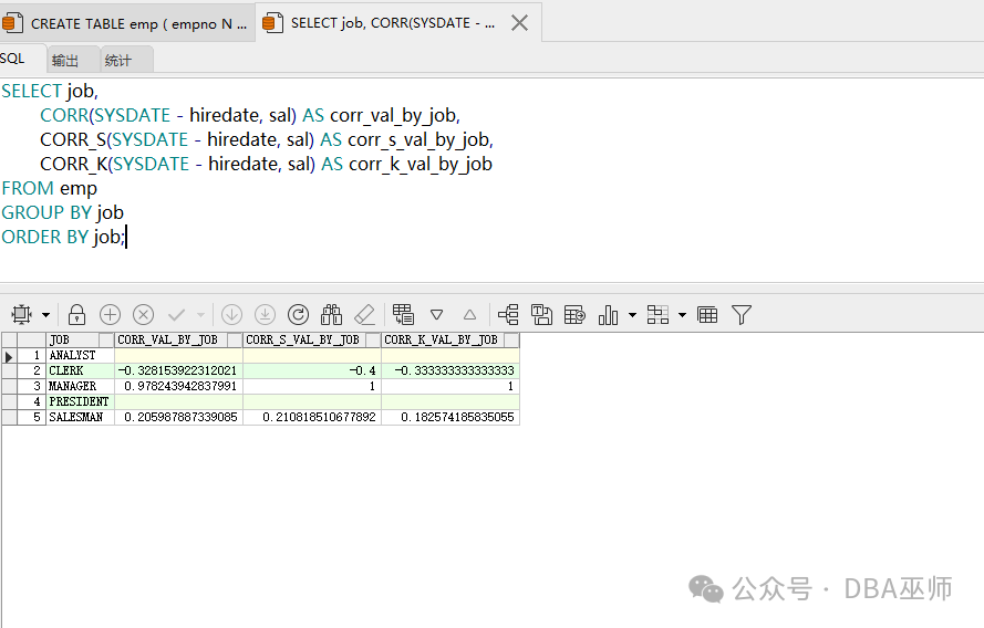 SELECT job,CORR(SYSDATE - hiredate, sal) AS corr_val_by_job,CORR_S(SYSDATE - hiredate, sal) AS corr_s_val_by_job,CORR_K(SYSDATE - hiredate, sal) AS corr_k_val_by_jobFROM empGROUP BY jobORDER BY job;