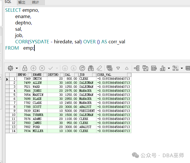 SELECT CORR(SYSDATE - hiredate, sal) AS corr_val,CORR_S(SYSDATE - hiredate, sal) AS corr_s_val,CORR_K(SYSDATE - hiredate, sal) AS corr_k_valFROM emp;