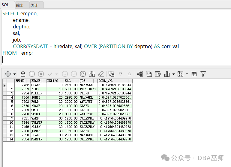 SELECT empno, ename, deptno, sal, job, CORR(SYSDATE - hiredate, sal) OVER (PARTITION BY deptno) AS corr_valFROM emp;