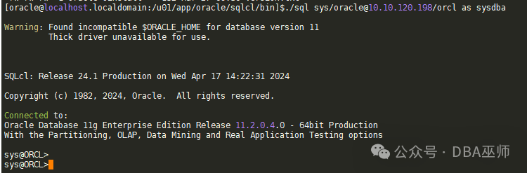 [root@localhost oswbb]# su - oracle[oracle@localhost.localdomain:/home/oracle]$cd u01/app/oracle/sqlcl/bin[oracle@localhost.localdomain:/u01/app/oracle/sqlcl/bin]$ls -lsrttotal 220-rw-rw-rw- 1 oracle oinstall 3198 Mar 27 09:30 dependencies.txt-rw------- 1 oracle oinstall 0 Apr 17 13:24 history.log-rwxr-xr-x 1 oracle oinstall 29816 Mar 27 09:29 sql-rw-r--r-- 1 oracle oinstall 180288 Mar 27 09:30 sql.exe-rw-rw-rw- 1 oracle oinstall 152 Mar 27 09:30 version.txt[oracle@localhost.localdomain:/u01/app/oracle/sqlcl/bin]$./sql sys/oracle@10.10.120.198/orcl as sysdba