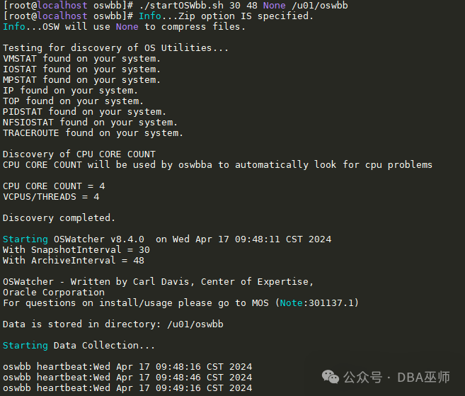 --设置oswbb报告存储路径[root@localhost u01]# export OSWBB_ARCHIVE_DEST=/u01/oswbb#启动oswbb#30是表示每30秒获取一次系统状态#48表示报告保存48小时[root@localhost oswbb]# ./startOSWbb.sh 30 48 None u01/oswbb