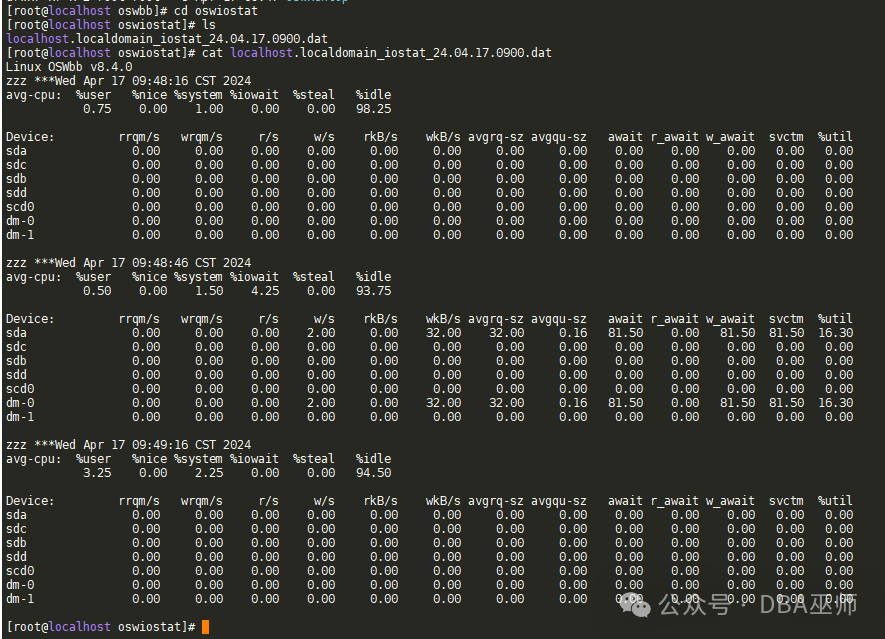 --举例:查看磁盘状态[root@localhost oswbb]# cd oswiostat[root@localhost oswiostat]# ls
