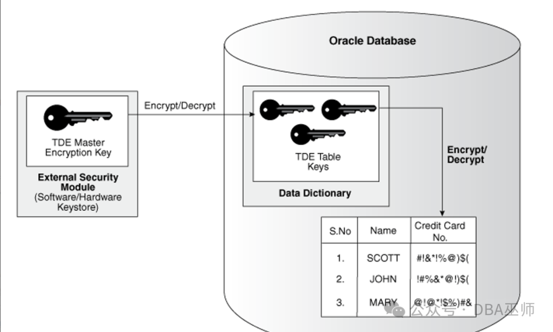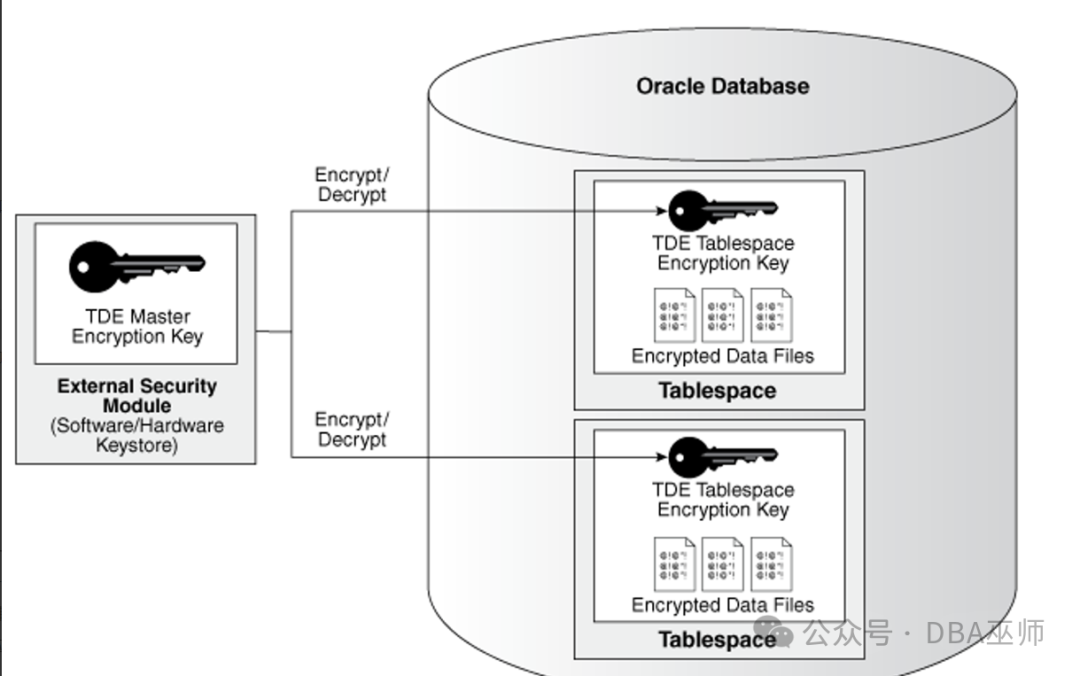TDE表空间加密的实现依赖于两层、基于密钥的架构。TDE主加密密钥存储在安全模块中,例如Oracle wallet、Oracle Key Vault或Oracle Cloud Infrastructure (OCI)密钥管理服务(KMS)。该TDE主加密密钥用于加密TDE表空间加密密钥,而TDE表空间加密密钥则用于加密和解密表空间中的数据。