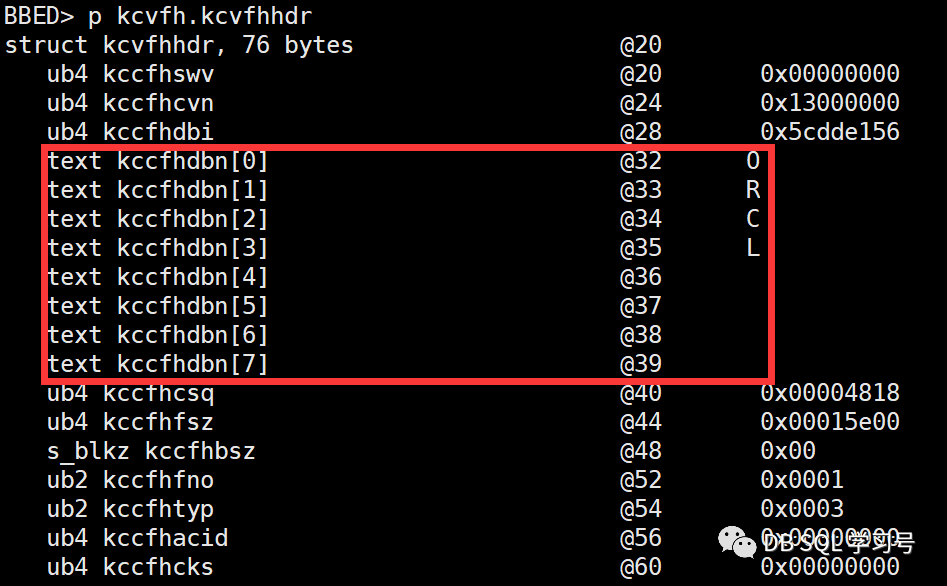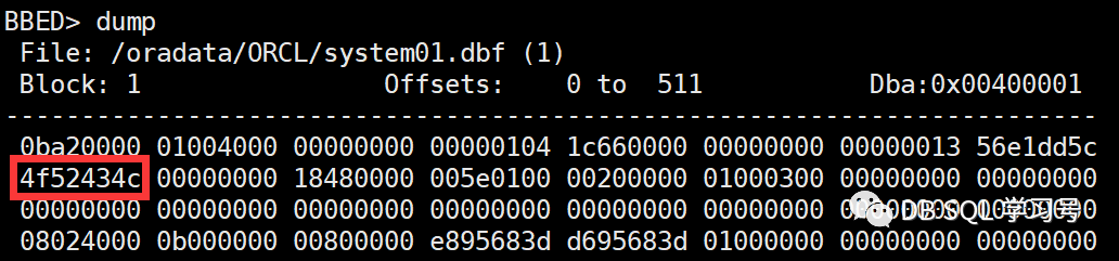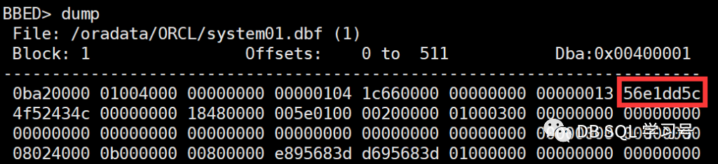此处我们看到,数据文件头只有八个字符的位置存储 Oracle 的数据库名,这也是我们为什么说,长度不能超过 8个字符,dump可以看到如下内容: