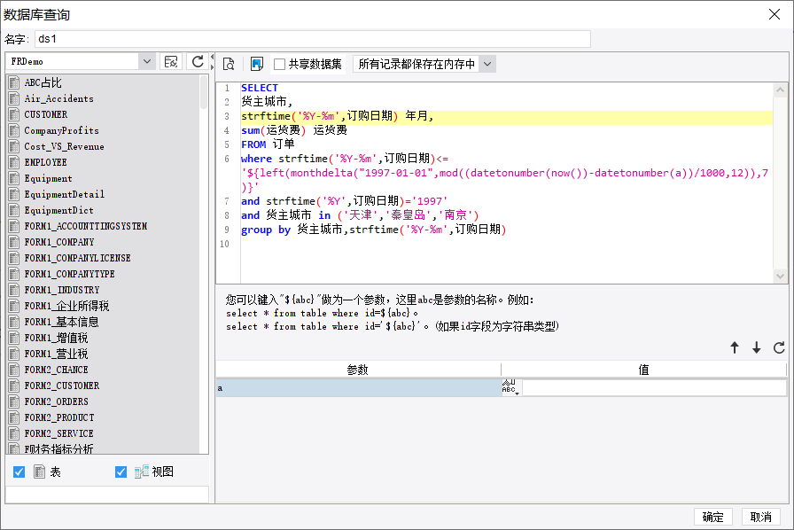 1)新建决策报表,创建数据集 ds1,数据库查询语句如下:
