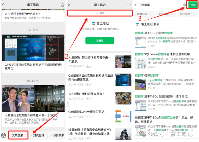 搜索方法(搜索只能在手机端完成):如下图所示,进入账号点击【文章搜索】,在最上方输入关键词【数据库】,然后点击【搜索】按钮即可。