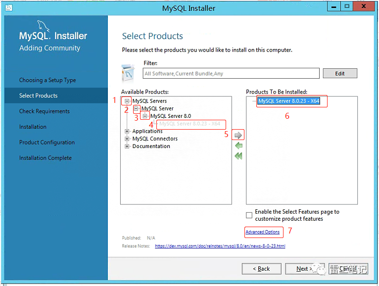 4、选中6所示添加到右侧的“MySQL Server 8.0.23 - X64”
