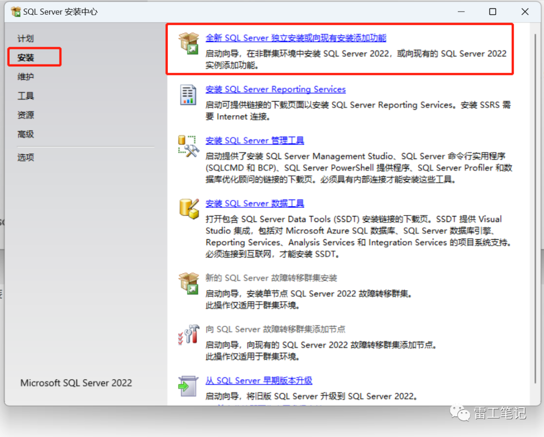 4、选择点击左侧的安装,然后点击右侧“全新SQL Server独立安装或向现有安装添加功能”。