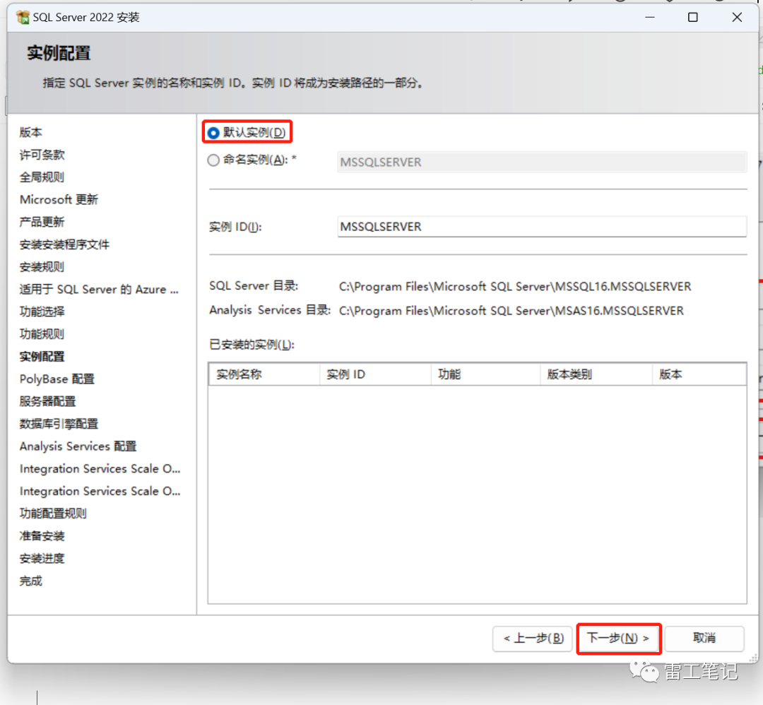 11、选择默认实例即可(如要命名,不可重复),然后点击下一步: