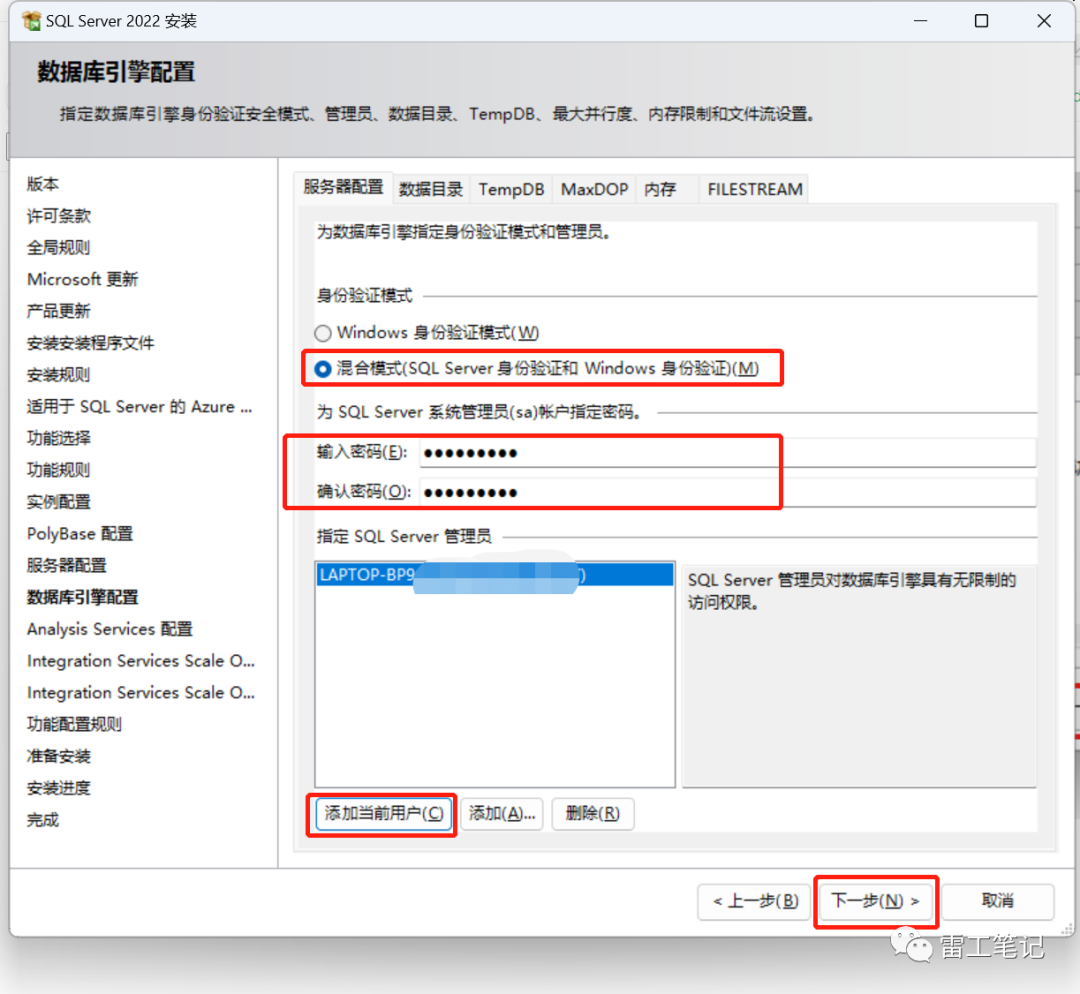 14、 选择混合模式,点击添加当前用户,为超级管理员(sa)设置密码(记住自己设置的密码)admin@123,添加当前账户,其余默认,然后点击下一步: