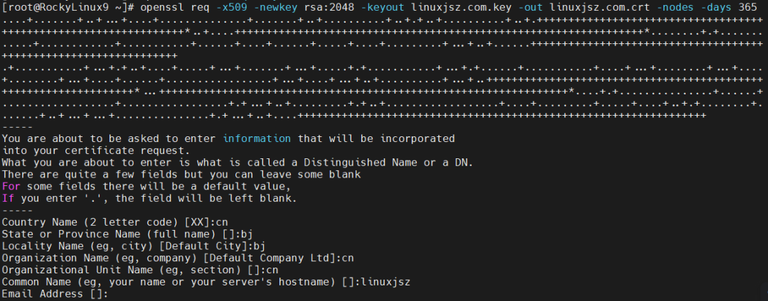 # 安装工具,默认情况下是已安装。[root@RockyLinux9 ~]# dnf install -y openssl[root@RockyLinux9 ~]# cd usr/local/nginx/conf/# 创建自签名证书[root@RockyLinux9 conf]# openssl req -x509 -newkey rsa:2048 -keyout linuxjsz.com.key -out linuxjsz.com.crt -nodes -days 365[root@RockyLinux9 conf]# ls linuxjsz.com.*linuxjsz.com.crt linuxjsz.com.key