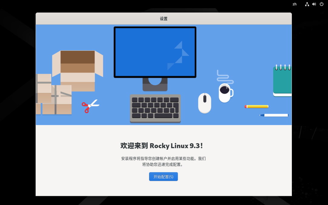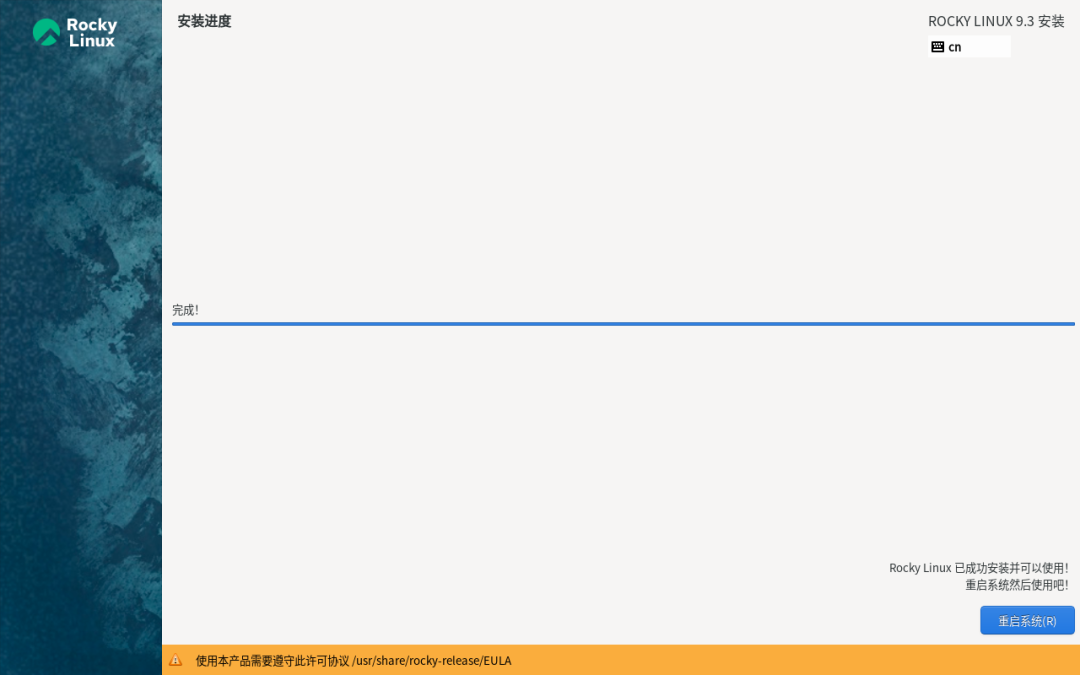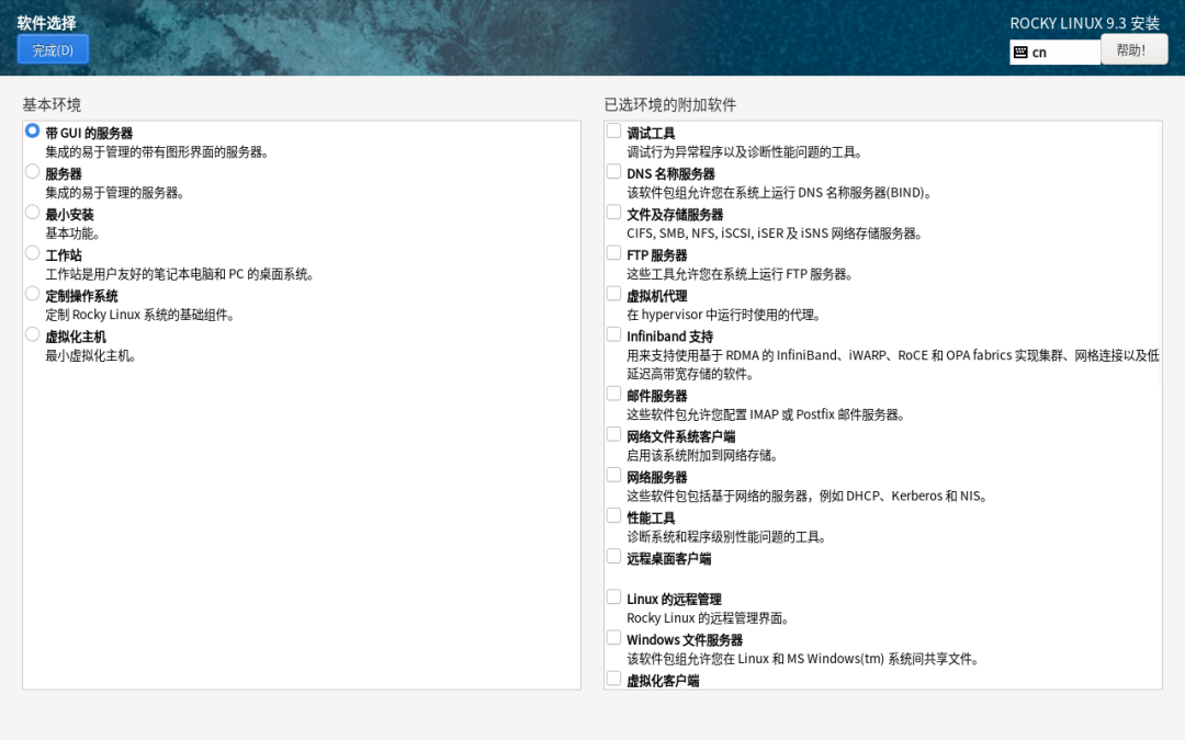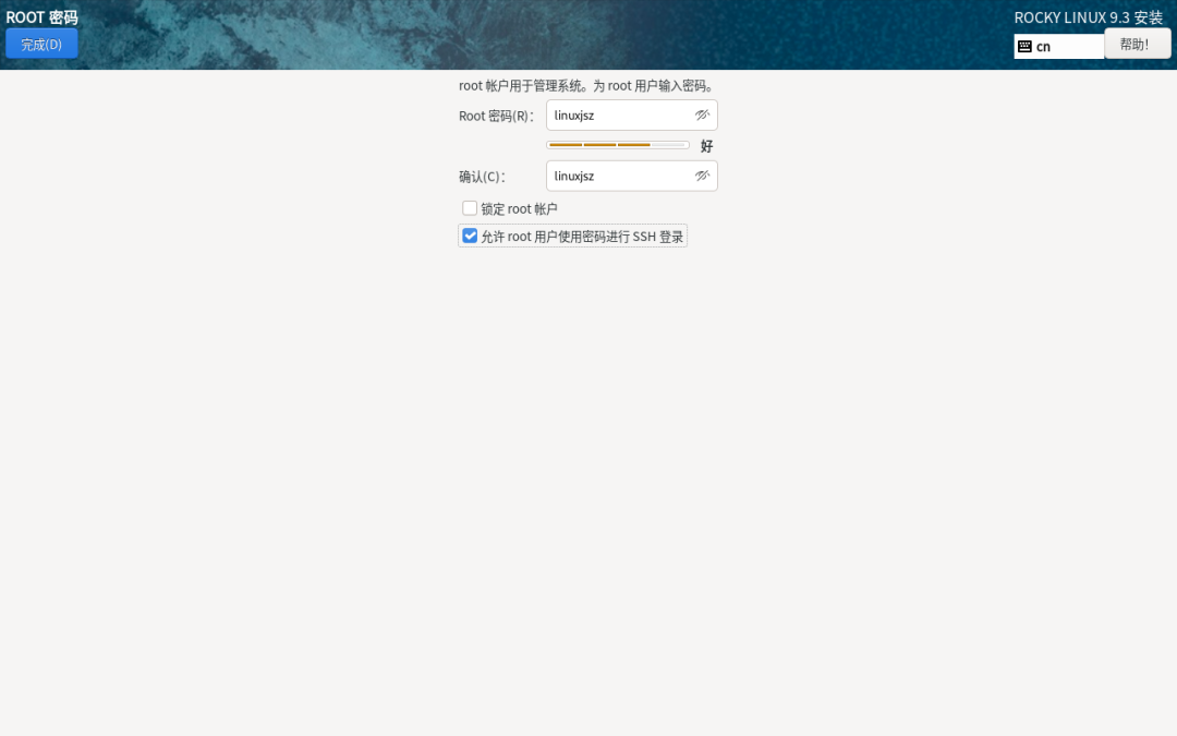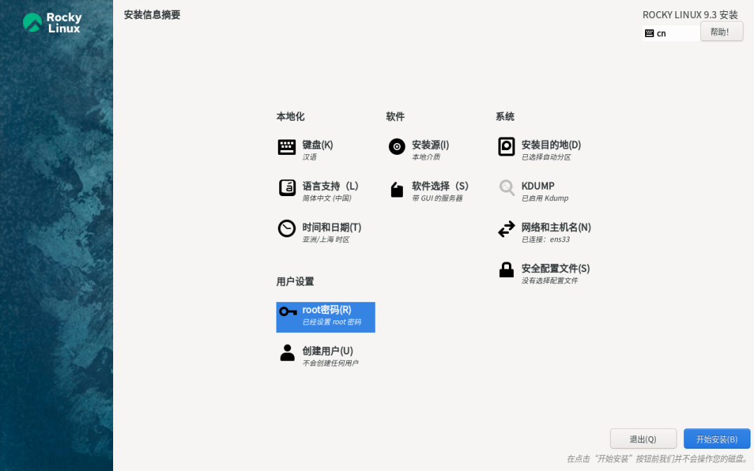 3.2.选择“Install Rocky Linux 9.3”。 3.4.进入信息摘要页面,点击“软件选择”→“带GUI的服务器”,点击“完成”。3.6.点击“root密码”,输入及确认密码“linuxjsz”,勾选“允许root用户使用密码进行SSH登录”3.15.到这里,Rocky Linux 9.3系统就安装完成了,打开终端。3.16.查看自动获取的IP,切换到root用户,测试是否可以正常上网,输入“poweroff”进行关机。